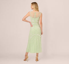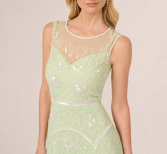 This beaded dress features a fitted bodice with sheer boat neckline that gives the illusion of a sweetheart neck, extended shoulder sleeves, and a soft, ankle-length skirt. A sequin beaded panel accents the waistline and accentuates the figure. All over contrast floral beading adorns the mesh overlay of this formal dress. A zipper back closure completes the look. This evening gown is a showstopper, and the perfect fit for your next gala.