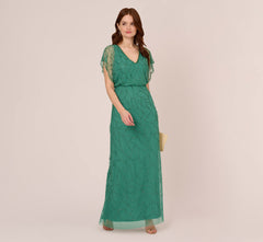 An unforgettable night out starts with this short sleeve beaded gown. This formal dress features a blouson bodice with v-neckline, sheer dolman sleeves, and a soft mermaid skirt. Lined through the body and overlaid with sheer mesh covered in lines of sparkling beads, this evening gown is a timeless style. A zipper closure at the back completes the short sleeve gown. Perfect for black-tie and formal events, this beaded dress will shine with nude heels and a contrasting clutch.