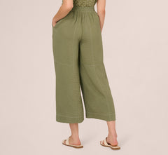 These cropped wide leg pants are crafted from a lightweight crinkle textured fabric that feels breezy and relaxed. Designed with contrast stitching that highlights the clean, modern lines, they feature an easy elastic waistband and handy side pockets for everyday comfort and convenience. The wide leg silhouette gives them a flowy, effortless drape that's perfect for casual days or warm weather getaways.