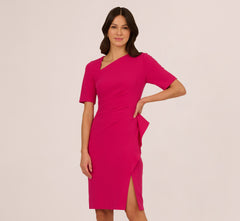 Asymmetric details set off this stylish crepe dress. This day dress features an asymmetrical neckline, sheath silhouette, and a ruffled accent at the hem that gives way to a slit in the skirt. Crafted from matte crepe fabric, this midi dress has flattering pleated draping. A zipper closure can be found at the back of this short sleeve dress. Paired with nude heels and classic earrings, this dress will take you from office to happy hour with ease.