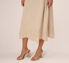 Flowy and effortlessly refined, this midi skirt is a versatile staple for any wardrobe. Designed with an easy pull-on construction, it features a comfortable elastic waist for a flexible fit. The A-line silhouette drapes beautifully, offering soft movement with every step. A scalloped hem, adorned with tonal floral embroidery, adds a romantic boho touch. Whether styled casually or dressed up, this skirt brings effortless charm to any outfit.