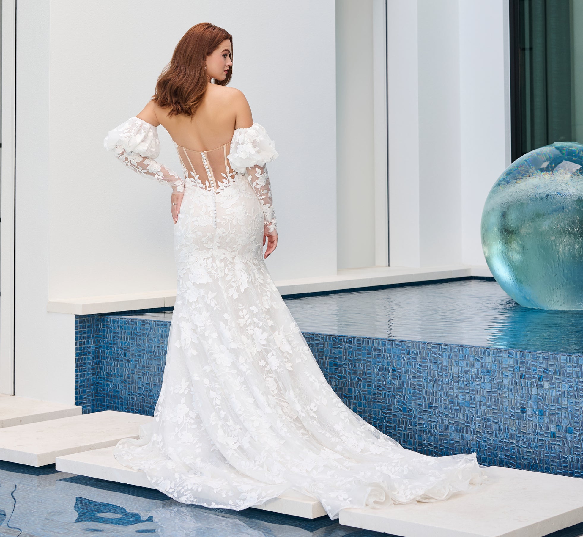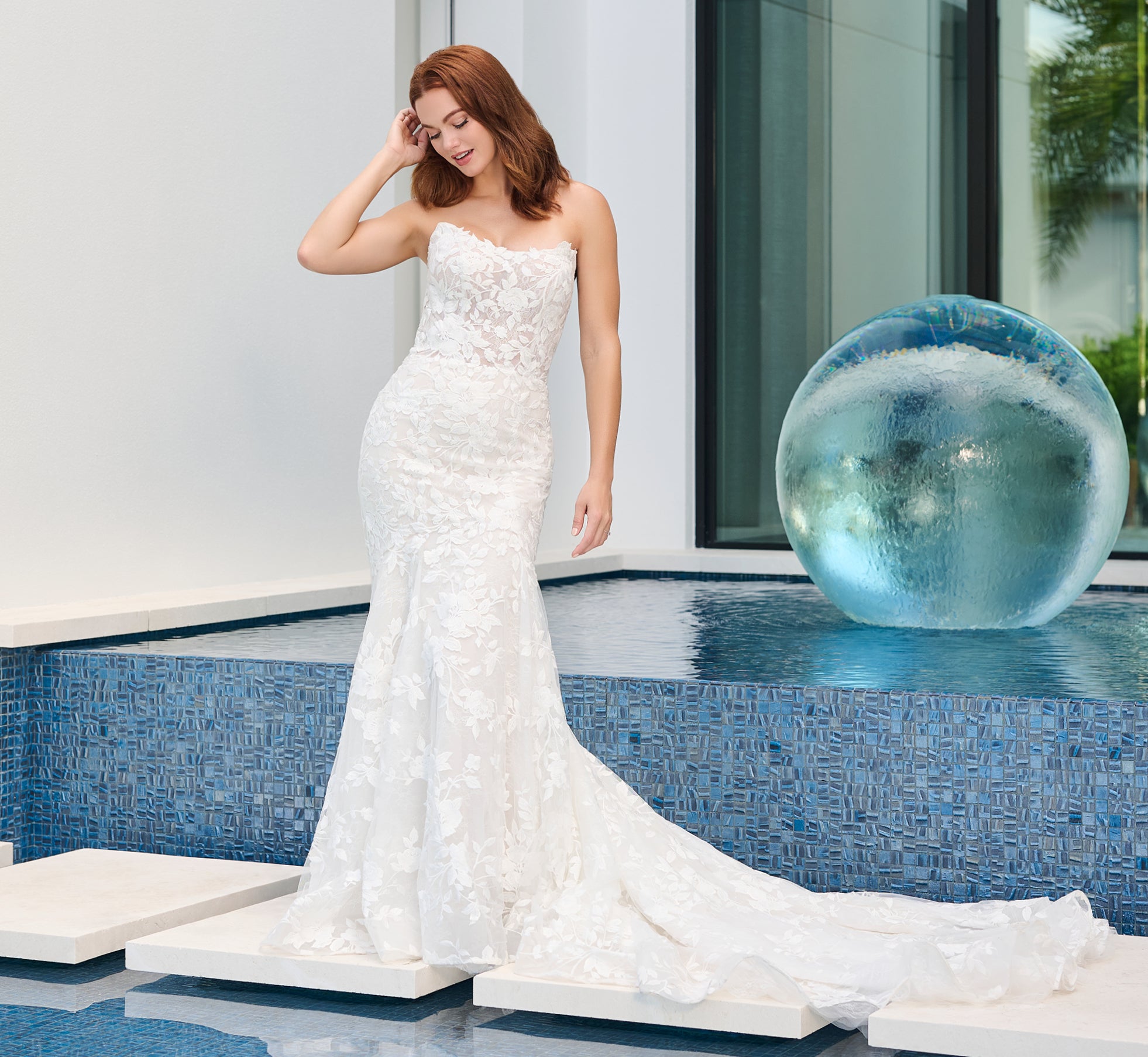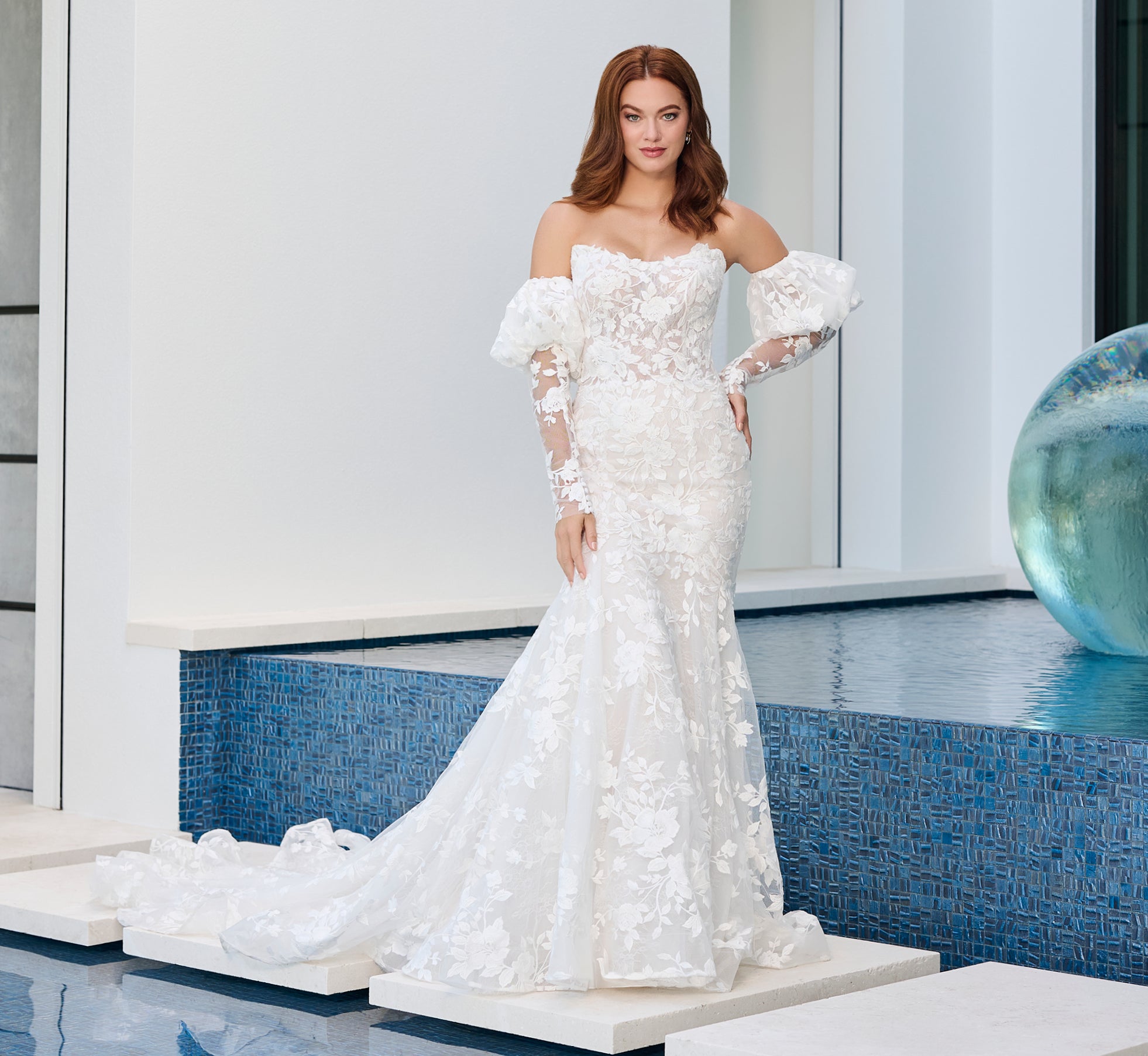 A stunning, floral matte lace has been placed over an all-over chantilly lace on this stunning mermaid gown. The scoop neckline leads to a semi sheer bodice and fitted body that opens up to a dramatic skirt.