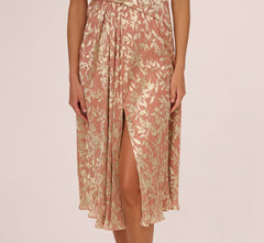 This lovely midi dress is made with flowy fabric with a foiled leaf pattern for a luxe finish. A faux wrap construction adds dimension to the design with pleated and draped details at the waist. Flutter sleeves give the soft A-line silhouette a romantic finish. A back zipper completes the design. Perfect for nights out and special occasions, you'll love the way you look and feel in this gorgeous metallic dress.