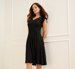 Soft texture meets refined shape in this effortlessly pretty midi dress. Made from sweater knit fabric, it offers cozy stretch with a polished finish. The double flounce flutter sleeves add a touch of charm, while the V neckline keeps the look clean and modern. A graduated ribbed texture gives the A line skirt a dimensional pleated effect. Finished with a matching tie belt to define the waist, this smart dress is a versatile piece that transitions seamlessly from day to dinner.