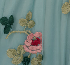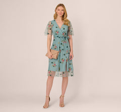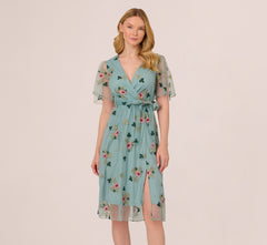 Colorful floral embroidery on an airy mesh overlay gives this blue knee-length dress a bright, lush look. Flutter sleeves and a gathered A-line skirt create a soft and romantic silhouette. The fit is defined with an elasticized waistband and a matching tie belt. A surplice neckline finishes the design for a dimensional wrap effect.