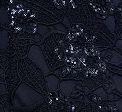 Make a stunning entrance in this elegant blue off-the-shoulder gown. The refined column dress design is crafted from shimmering sequin lace fabric. The bell sleeves, adorned with a soft organza underlay, add a touch of romantic drama to the look. A discreet back zipper closure ensures a seamless fit, making this dress perfect for formal occasions or evening galas.