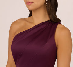 Festive and feminine, a modern gown in silky satin crepe and a chic, one-shoulder strap. Designed in a streamlined silhouette that fits like a dream. Details We Love: the subtle ruffle and exquisite drape of the skirt.