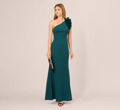 Sculptural and sophisticated, this one shoulder gown is crafted from smooth knit crepe that offers soft structure with graceful movement. The mermaid silhouette is shaped by princess seams for clean, elongated lines, while a voluminous ruffle detail at the shoulder strap adds dramatic flair. The asymmetrical neckline brings a modern edge, balancing elegance with a touch of boldness. Perfect for formal weddings, black tie galas, or evening receptions, this gown is designed to make an impression without saying a word.