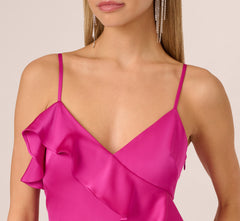 Add a little extra drama to your evening look with this stretch satin gown. Ruffle trim cascades down the dress on diagonal lines, adding movement and dimension to the classic A line silhouette. Spaghetti straps and a wide V neck create a delicate face framing effect. A side zipper closure ensures the perfect fit. Romantic with a modern edge, you'll turn heads every time you wear this gown.