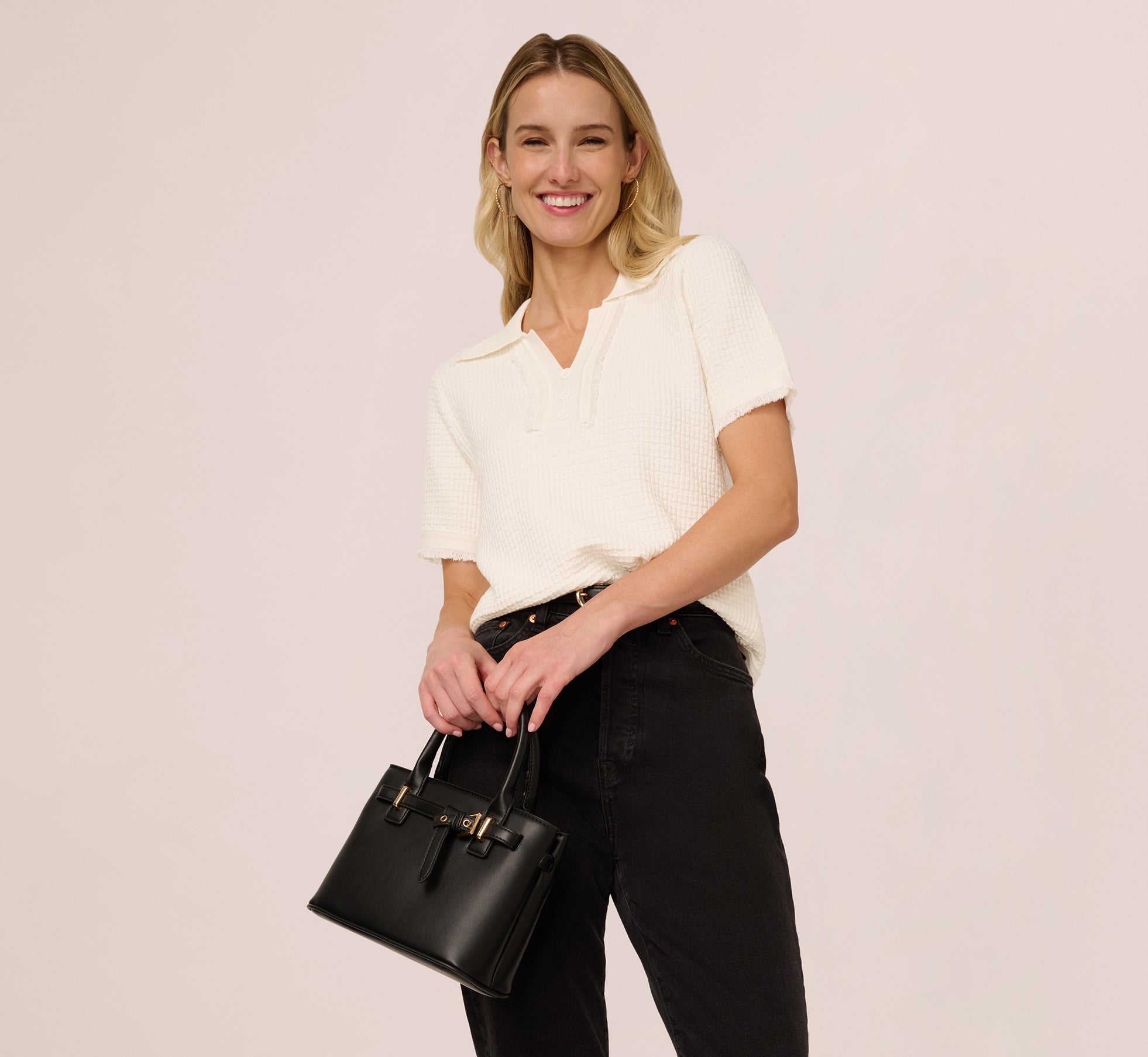 Waffle weave fabric gives this smart short sleeve top soft structure and a textured look. The open polo collar is finished with delicate fringe trim and three decorative buttons down the front. Matching fringe along the cuffs and the hem completes the look. Versatile and easy to style, this polo shirt gives you endless options for mixing and matching everyday ensembles.