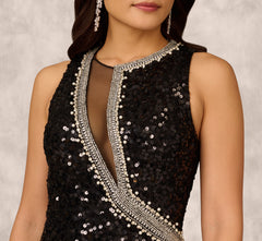 Make a dazzling entrance in this statement making sequin gown. Designed in a sleek sheath silhouette, this floor length style is covered in allover sequin embellishment that catches the light from every angle. The asymmetrical illusion neckline creates dramatic contrast, featuring a sheer mesh inset and a sweeping band of sparkling beadwork that curves elegantly across the bodice. Sophisticated and striking, it's the perfect choice for black tie events, galas, or any evening that calls for a bold finish.