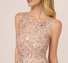 Allover hand-applied sequins and floral beading give this blush pink boat neck gown rich and sparkling texture. The peplum bodice over the column skirt creates a classically graceful silhouette and a back zipper finishes the design. This elegant dress contrasts a clean construction with intricate embellishment for a thoughtful and balanced approach to eveningwear.