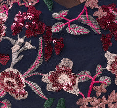 Intricate embroidery and a graceful silhouette give this midi dress its elevated charm. Designed in a soft A line shape, it features allover multicolor floral embroidery finished with subtle sequins for a hint of shimmer. The illusion neckline and narrow shoulders create a refined, elongating effect that balances the full skirt beautifully. Perfect for special occasions, this piece combines texture, color, and light catching detail into one romantic look.