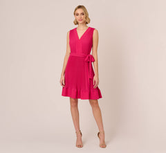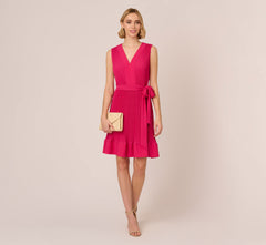 Mini pleats lend beautiful texture to this sleeveless dress. This dress features a sleeveless bodice with v-neckline, self-tie waist, and flounce skirt hem. Designed from pleated fabric with figure flattering solid fabrication at the bodice that contrasts the pleating, this fit and flare dressis a versatile look for your day. A zipper closure at the side of the dress completes the design. Pair this dress with a blazer and pumps for a day at the office or opt for nude heels and dressier accessories for date night. No matter how you style this pleated dress, it will impress.