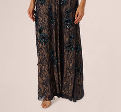 Delicate yet dramatic, this floor length gown stuns with its soft A line silhouette and intricate detailing. Crafted from romantic lace fabric, it's adorned with scattered sequin embellishment and dimensional paillette flower accents that catch the light from every angle. The boat neckline and narrow shoulders lend an elegant, statuesque feel, perfect for formal evenings when you want to sparkle with subtle glamor.