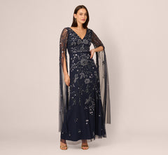 Dramatic and opulent, this beaded gown features floor length split sleeves for an ethereal cape effect. The mesh overlay is hand embellished with a symmetrical floral motif that trails down to the hem in embroidery, beadwork, and sequin details. A soft A line skirt and a structured bodice with a V neckline create a subtly flowing silhouette. Turn heads at your next formal or black tie event with this utterly glamorous evening dress.