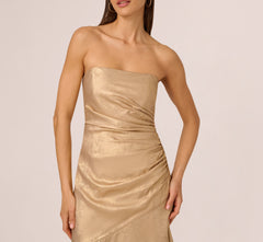 Catch the light in this shimmering strapless gown, crafted from airy fabric woven with a foiled finish. The tailored bodice features gathered and ruched details along the side seam to define the waist. An asymmetrical flounce along the skirt highlights the flowy A line silhouette. Perfect for formal events and special occasions, this glam evening dress will turn heads anywhere you wear it.