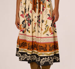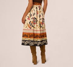 Add a touch of breezy charm to your wardrobe with this vibrant midi skirt, designed in a flattering A line silhouette that flows effortlessly with every step. The wide waistband features an elastic panel at the back for a comfortable fit and an adjustable tie front detail for a polished finish. Decorated with a tropical floral print and bold contrast patterning along the hem and waistband, this skirt brings a rich, bohemian feel to your look. Finished with practical side pockets, it's a versatile favorite for everything from office wear to weekend brunch.