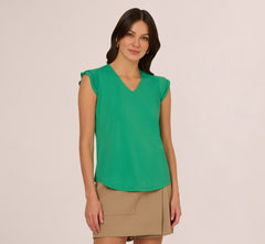 A feminine take on a beloved silhouette, this top is a lovely style. This blouse features a v-neckline, streamlined silhouette, and flutter sleeves with pleated trim. Pair this business casual top with a high-waisted skirt or trousers for a look that will shine at the boardroom table and the brunch table.