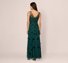 Bring the enchantment with our exquisite floral beaded gown. This formal dress features a v-neckline, v-back, and a soft skirt. Crafted from mesh knit fabric, this evening gown is covered in velvet flower accents with beaded stems. Beading also adorns the waist of this sleeveless gown. Sheer tank straps offer subtle support while maintaining an ethereal aesthetic. With elegant shirring at the bust and a convenient zipper closure at the center back, this black-tie gown ensures a flawless fit. Perfect for glamorous evenings and special occasions, this beaded gown promises to captivate with its timeless elegance and intricate detailing.